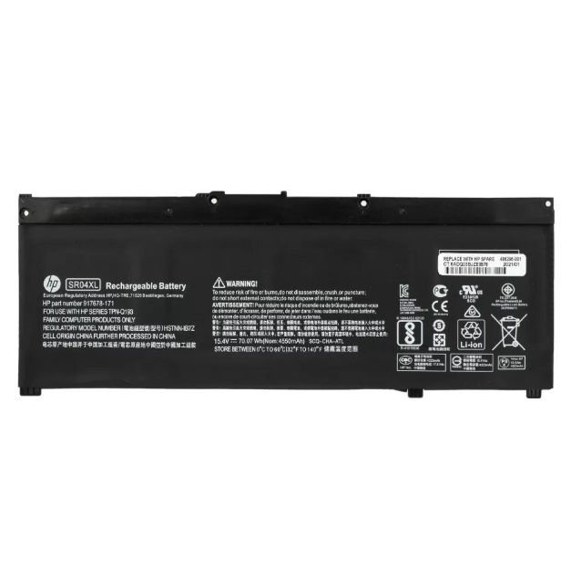 Оригинальная аккумуляторная батарея SR04XL для HP Omen 15-ce, 15-dc, 15-cb, Pavilion 15-cxх общей емкостью 4550 mAh, срок службы 3-4 года. Предназначена для автономного питания ноутбуков HP. Батарея упакована в пластиковый пакет и размещена в гофрированной картонной коробке с противоударными поролоновыми вставками.