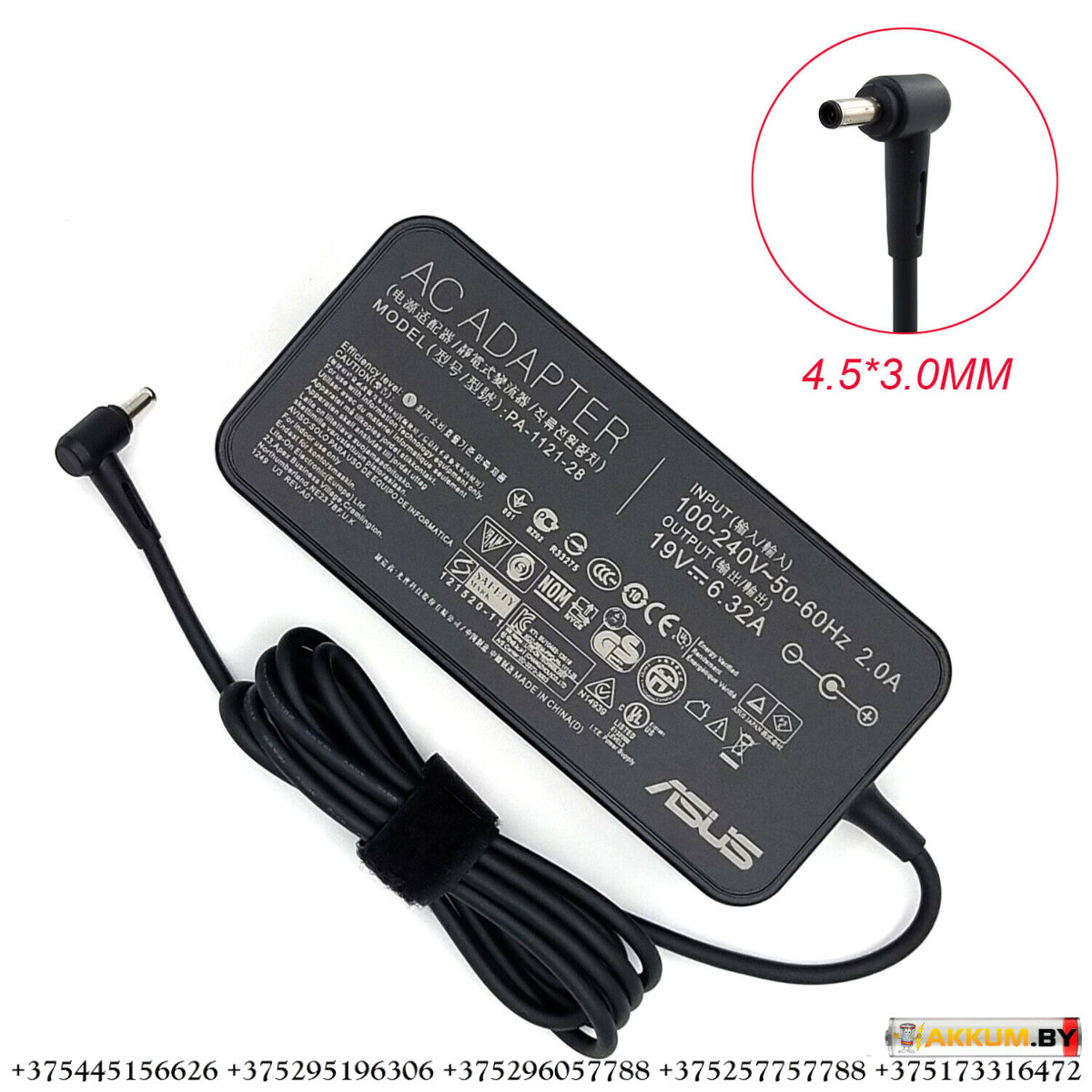 Зарядное устройство ASUS 19V 6.32A (4.5x3.0) 120W имеет все сертификаты качества и соответствует всем нормам безопасности.