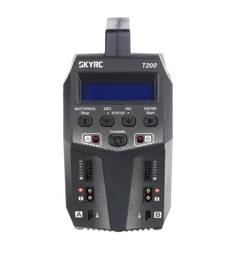 Характеристики и описание Устройство SkyRC T200 Charger имеет автоматическую функцию, которая определяет питающий ток во время процесса зарядки или разрядки. В частности, для литиевых батарей она способна предотвратить перегрузку, которая может привести к взрыву по вине пользователя. Функция может автоматический разъединить в цепи и может дать сигнал, обнаружив какой-либо сбой. Все программы данного устройства были отрегулированы при помощи двухстороннего соединения и коммуникации с целью достижения максимальной безопасности и минимизации неполадок. Все настройки могут быть видоизменены пользователями. Для восстановления батареи и балансирования с целью поддержания функциональности батареи имеются от 1 до 5 циклических и продолжительных процессов зарядки-разрядки.